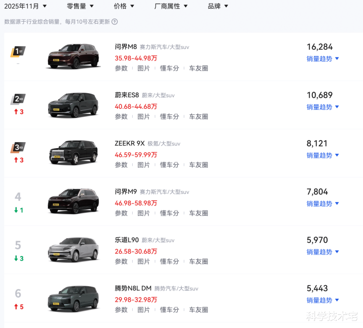 今年大型SUV市场的竞争非常激烈,除了问界M8、问界M9这种价格相对较高的车型,不少厂商也推出了“性价比”很高的“半价问界”,例如乐道L90、腾势N8L DM、领克900、风云T11、深蓝S09,有些车型的起售价不到二十万,大部分车型的最低配也只要二十多万,但尺寸和问界M8、问界M9都是一个级别的,可见这个市场还是很卷的。
